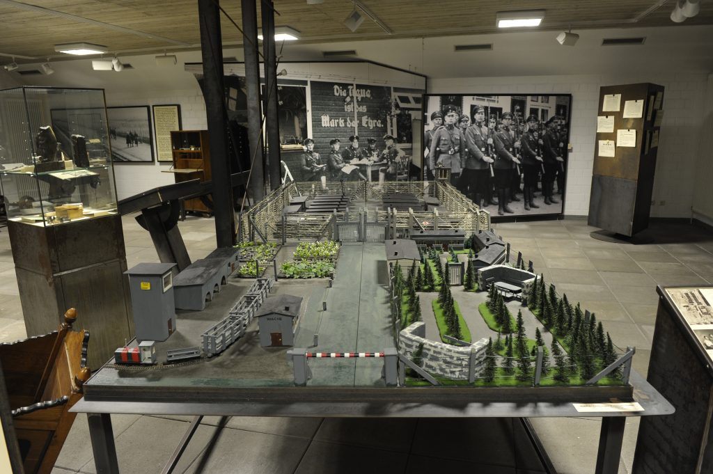 Der erste Blick fiel auf das Modell des Lagers II Aschendorfer Moor. Dahinter SA-Wachmannschaften. Das Lagermodell hatte der ehemalige Häftling Willi Pütz lange Zeit nach dem Krieg aus seiner Erinnerung heraus in seinem Keller gebaut. Er schenkte es dem DIZ und kam häufiger aus dem Ruhrgebiet, um kleine Reparaturen oder Veränderungen vorzunehmen.