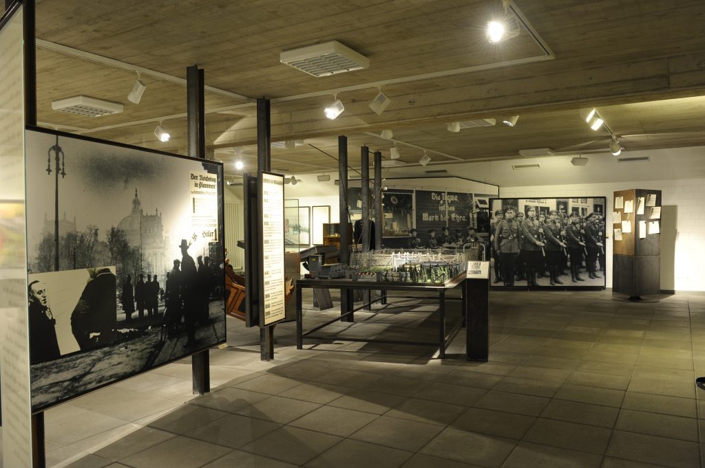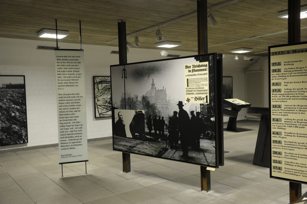 Der Blick nach halblinks zeigt ein Großfoto mit dem brennenden Reichstag in Berlin in der Nacht vom 27. auf den 28. Februar 1933. Eingeblendet ist ein Wahlplakat der NSDAP zur Reichstagswahl ein paar Tage später am 5. März 1933. Die Nationalsozialisten behaupten auf dem Plakat, der Reichstag sei von Kommunisten in Brand gesteckt worden. Eine weitere Einblendung zeigt den Publizisten und Pazifisten Carl von Ossietzky im Konzentrationslager Esterwegen. Er war noch in der Nacht des Reichstagsbrands verhaftet und im Februar 1934 in das im Sommer 1933 fertiggestellte Konzentrationslager Esterwegen verbracht worden.